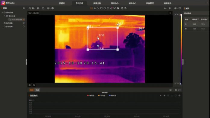 实时监控,快速捕捉温度变化:TI Studio PC端在线分析模块支持在实时预览过程中,快速采集温度数据并形成温度变化趋势曲线。系统最高可达0.1秒/次的频率采集温度,支持多区域温度对比与曲线冻结功能,帮助工程师在高速运行的生产线中,一眼识别异常波动。